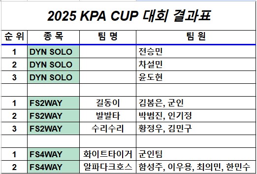 목록 실내스카이다이빙대회 결과 공지 본문 회원 여려분 안녕하세요? 지난 8일에 열렸던 2025한국스카이다이빙협회장배 실내스카이다이빙대회 결과를 공지해 드립니다. 이 대회에는 총 10개팀 20명의 선수들이 참가했으며, 종목별 순위는 표와 같습니다. 다음 대회 때는 더 다양한 종목에 더 많은 회워님들이 참가하게 되면 좋겠습니다. 한 국 스 카 이 다 이 빙 협 회 목록